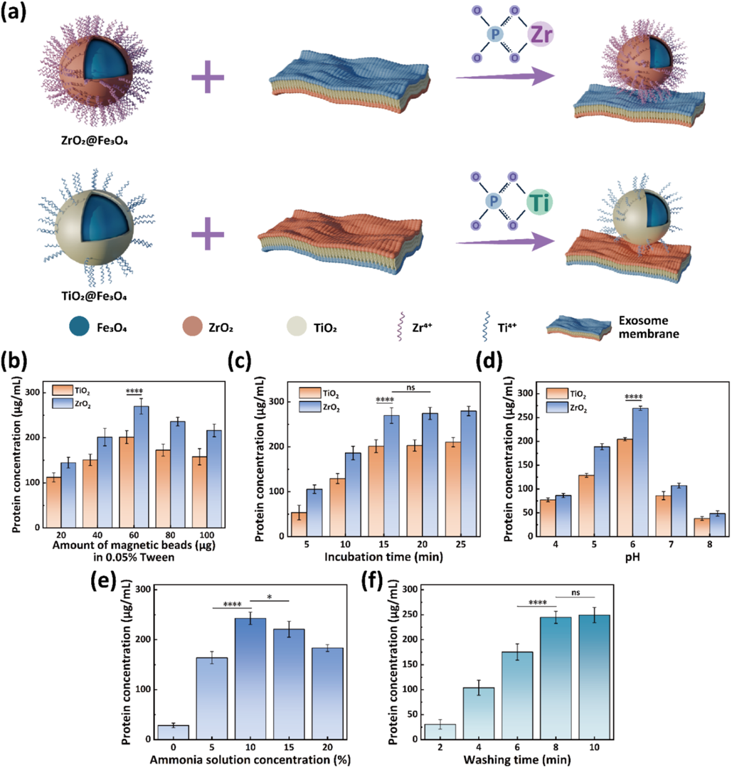 Figure 2. Optimization of EV enrichment and elution conditions for the DMF-ZrO2@Fe3O4 method. (a) Schematic illustration of the chemical mechanism for EV enrichment using ZrO2@Fe3O4 and TiO2@Fe3O4 beads. (b−d) Effects of magnetic beads, incubation time, and solution pH on EV enrichment efffciency. (e, f) Effects of ammonia concentration and elution time on EV elution efffciency. (ns: not signiffcant, *: P < 0.05, ****: P < 0.0001).