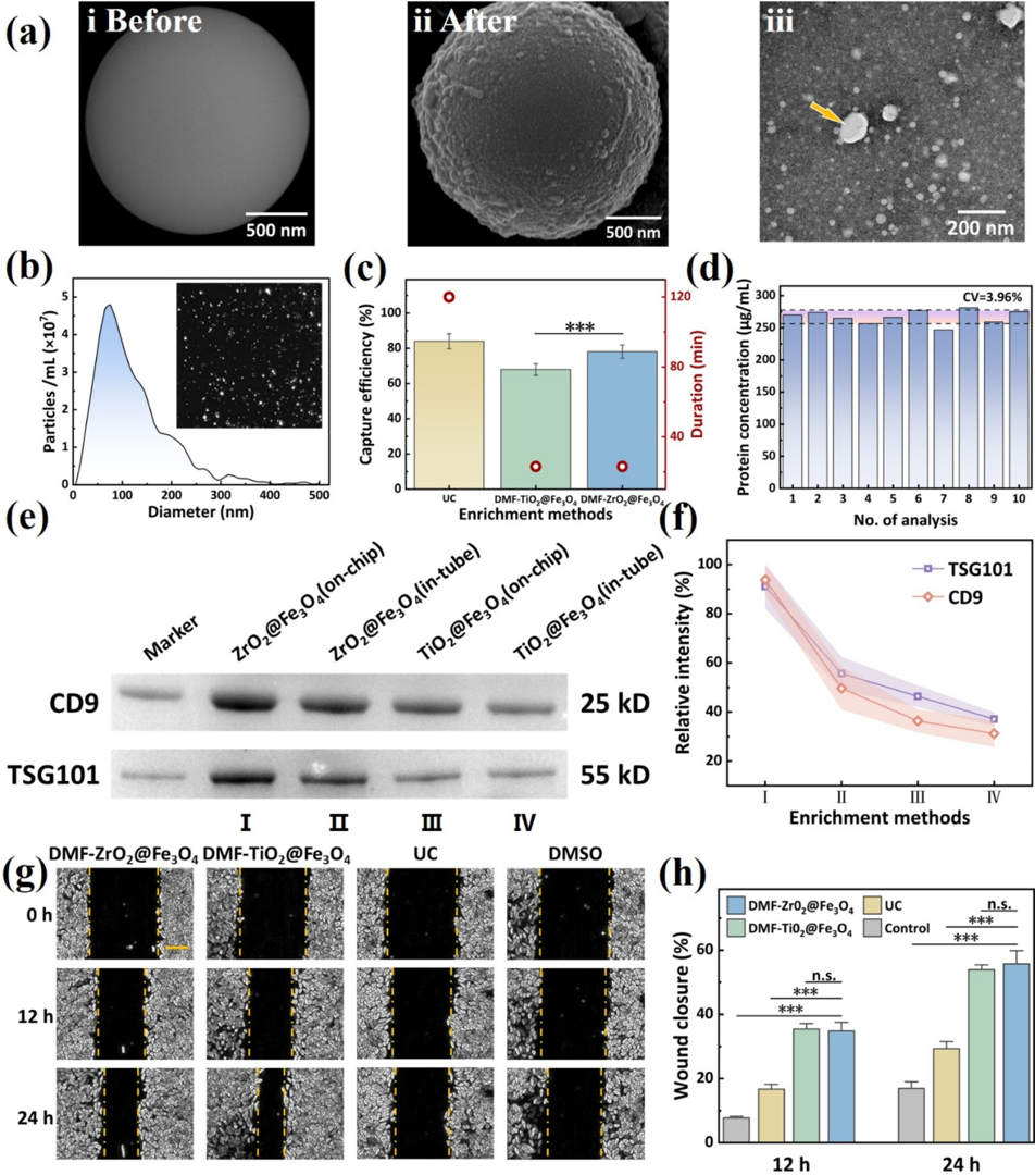 Figure 3. Characterization and evaluation of EVs enriched using the DMF-ZrO2@Fe3O4 strategy. (a) SEM images of ZrO2@Fe3O4 beads before (i) and after (ii) incubation with EV samples on the DMF chip, and a TEM image of the eluted vesicles with an arrow pointing to the cup-shaped EV (iii). (b) NTA of the isolated EVs. (c) Comparison of the recovery rate and time required for EV enrichment using different approaches. (d) Reproducibility analysis of EV enrichment using the DMF-ZrO2@Fe3O4 method. (e, f) Western blot analysis of CD9 and TSG10l in EVs isolated either on-chip or intube using ZrO2@Fe3O4 or TiO2@Fe3O4. (g) EVs enriched with different methods were added to the medium for culturing HeLa cells in a scratch assay. The control group was treated with an EV-free culture medium. Cell migration was monitored at 12 and 24 h of culture. (The scale bar is 200 μm.) (h) The scratch healing rate of HeLa cells was determined by calculating the ratio of the scratch width at 12 or 24 h to the scratch width at 0 h. (n.s.: not signiffcant, ***: P < 0.001).
