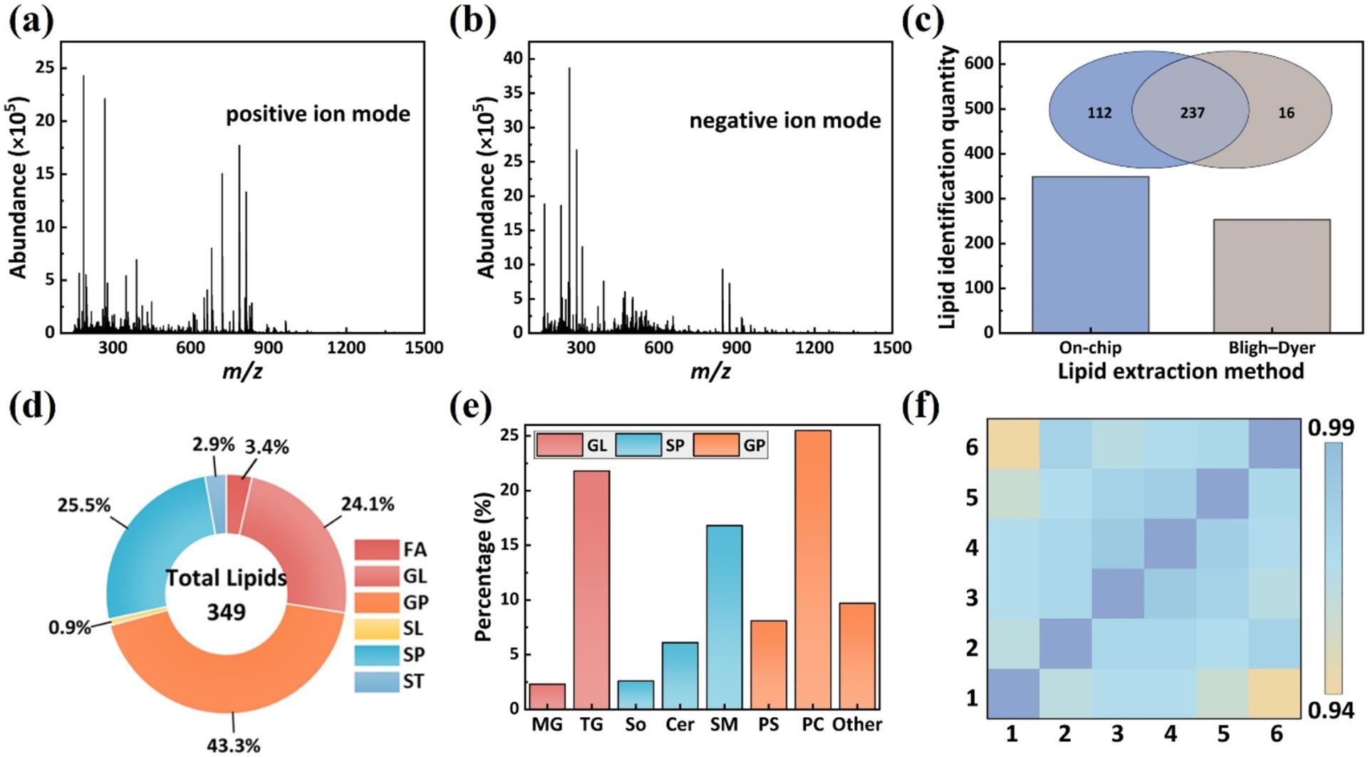 Figure 4. Lipid proffling of HeLa-cell-derived EVs. (a, b) Massspectra of extracted exosomal lipidsin positive and negative ion modes. (c) Comparison of lipid identiffcation quantities between on-chip extraction and the classic Bligh−Dyer method. (d) Classiffcation and (e) subclassiffcation of identiffed lipids from enriched EVs from HeLa cells. (f) Correlation analysis of lipid abundances between replicates.