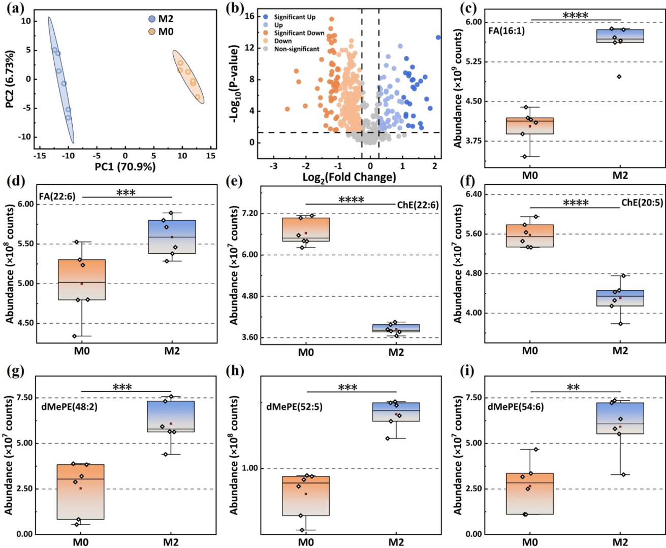 Figure 5. Lipid analysis of EVs derived from M0 and M2 mouse macrophages. (a, b) Principal component analysis (PCA) and volcano plot of lipids in EVs from M0 and M2 mouse macrophages (Up: FC > 1.5, P < 0.05, Signiffcant Up: FC > 2, P < 0.05). Abundance comparisons of FA(16:1) (c), FA(22:6) (d), ChE(22:6) (e), ChE(20:5) (f), dMePE(48:2) (g), dMePE(52:5) (h), and dMePE(54:6) (i) in EVs from M0 and M2 mouse macrophages. (**: P < 0.01,***: P < 0.001,****: P < 0.0001.).